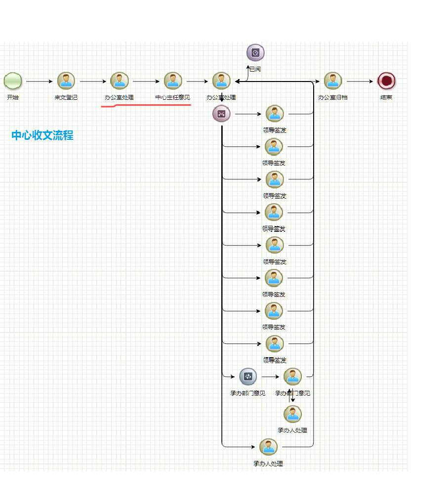 中心收文流程:增加办公室意见和中心主任意见节点如下图: